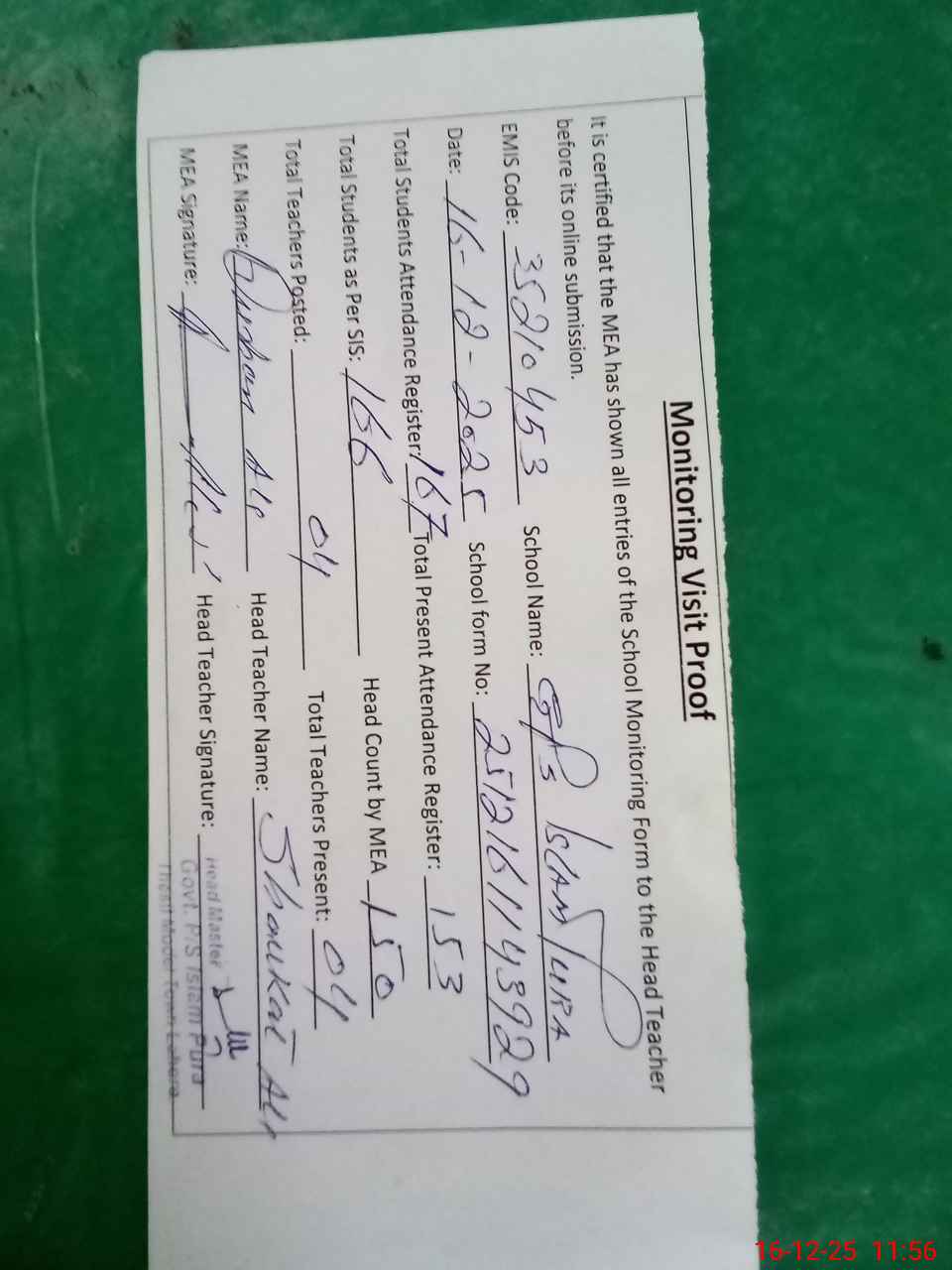 | Attendance Register | Head Teacher | MEA with School | Visit Proof |