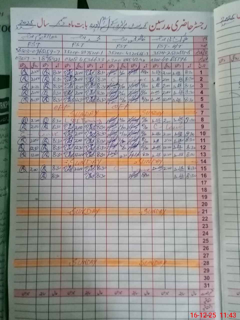 | CNIC | Full Name | Designation | R/C | Absence During Last Calender Month |