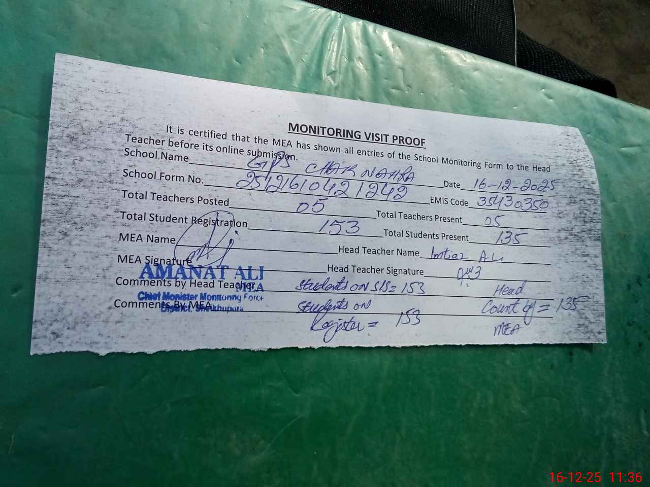 | Attendance Register | Head Teacher | MEA with School | Visit Proof |