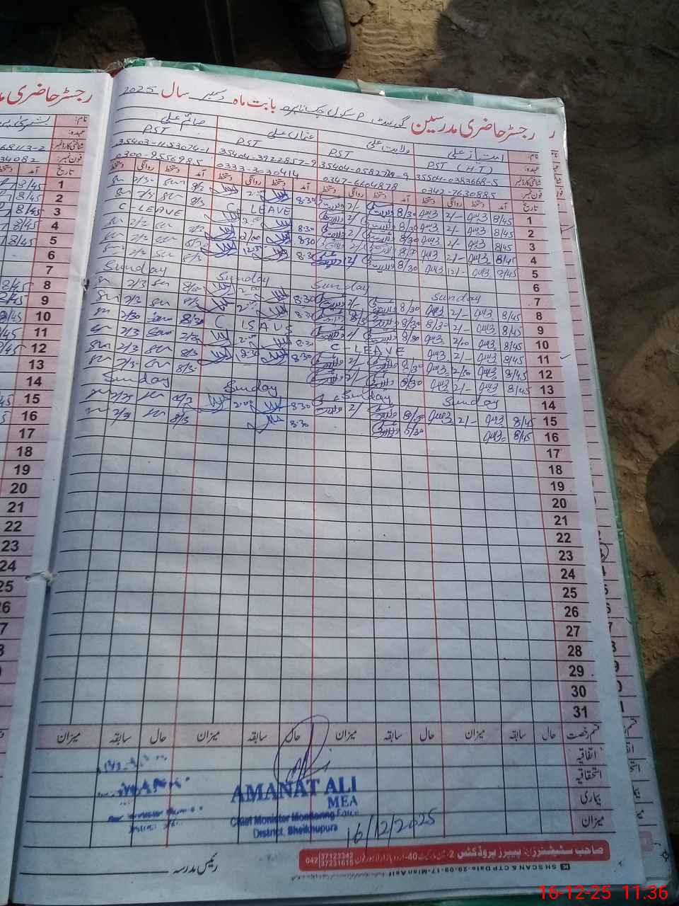 | CNIC | Full Name | Designation | R/C | Absence During Last Calender Month |