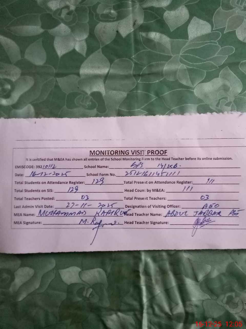 | Attendance Register | Head Teacher | MEA with School | Visit Proof |