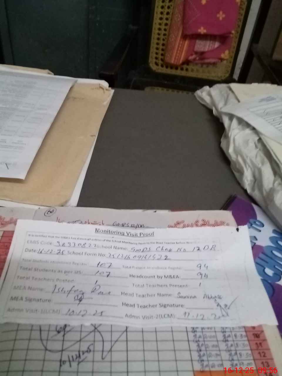 | Attendance Register | Head Teacher | MEA with School | Visit Proof |