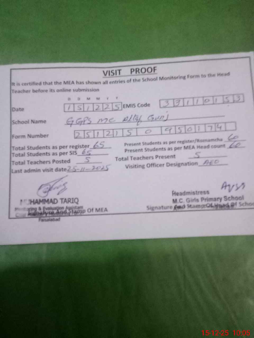 | Attendance Register | Head Teacher | MEA with School | Visit Proof |
