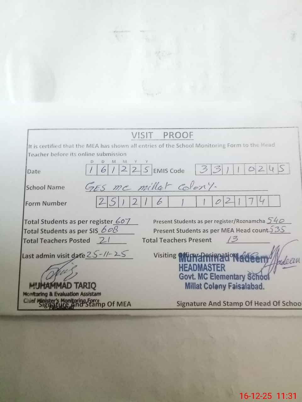 | EMIS Code: 33110245 | Name of School: GES MC MILLAT COLONY | |||