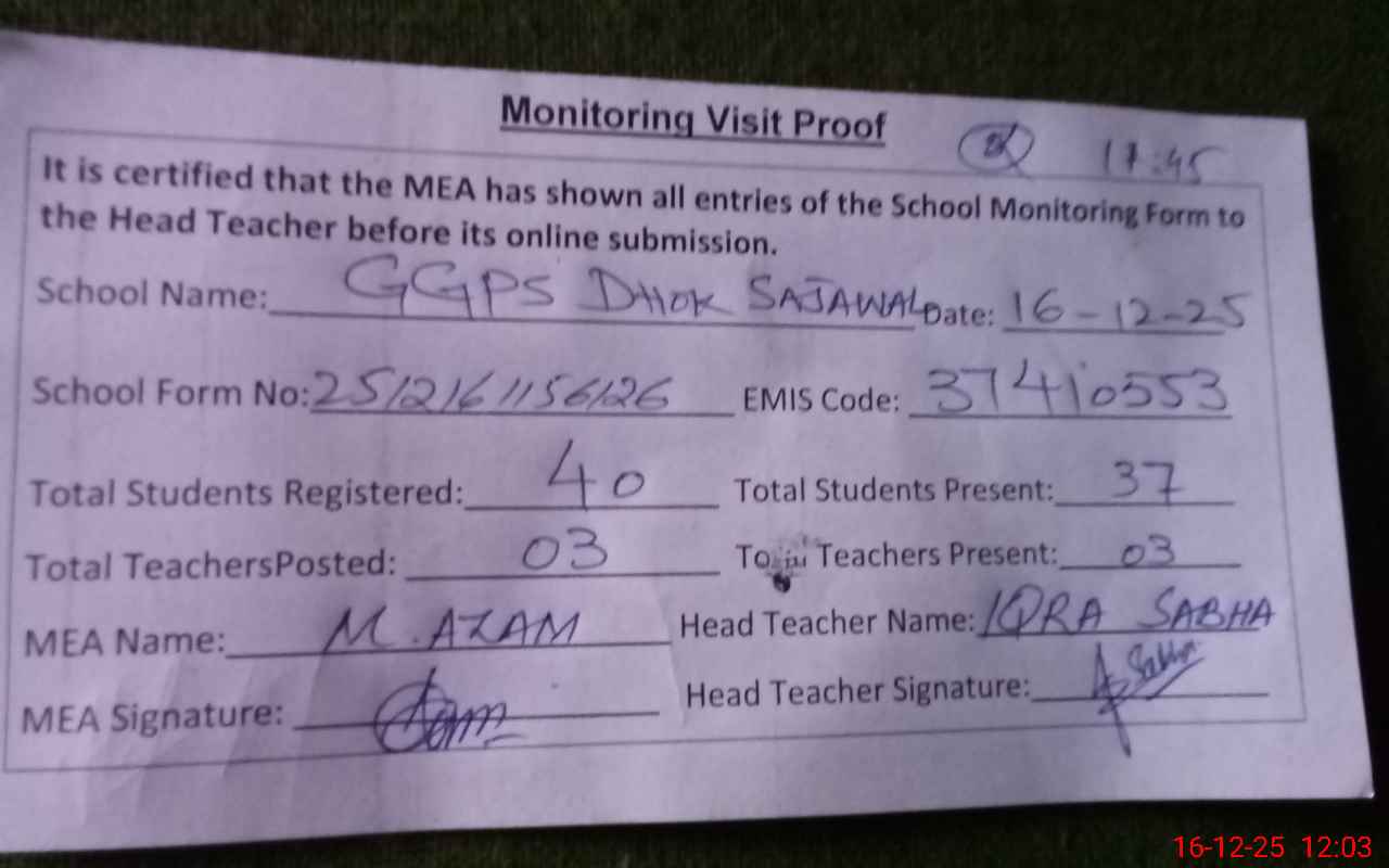 | EMIS Code: 37410553 | Name of School: GGPS DHOK SAJWAL | |||
