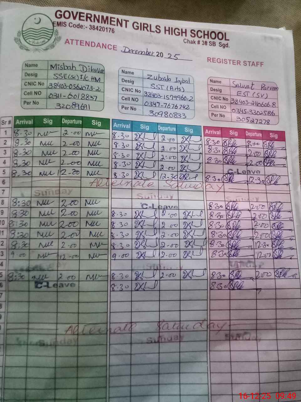 | CNIC | Full Name | Designation | R/C | Absence during last cal. month |