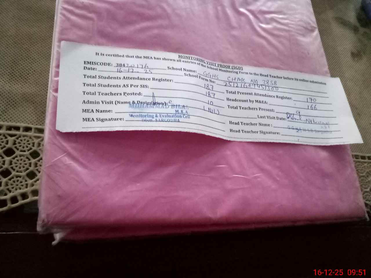 | Certified that this School was Inspected by the Undersigned MEA/DMO Today and the Information Stated Above is as Per Record. | |||||