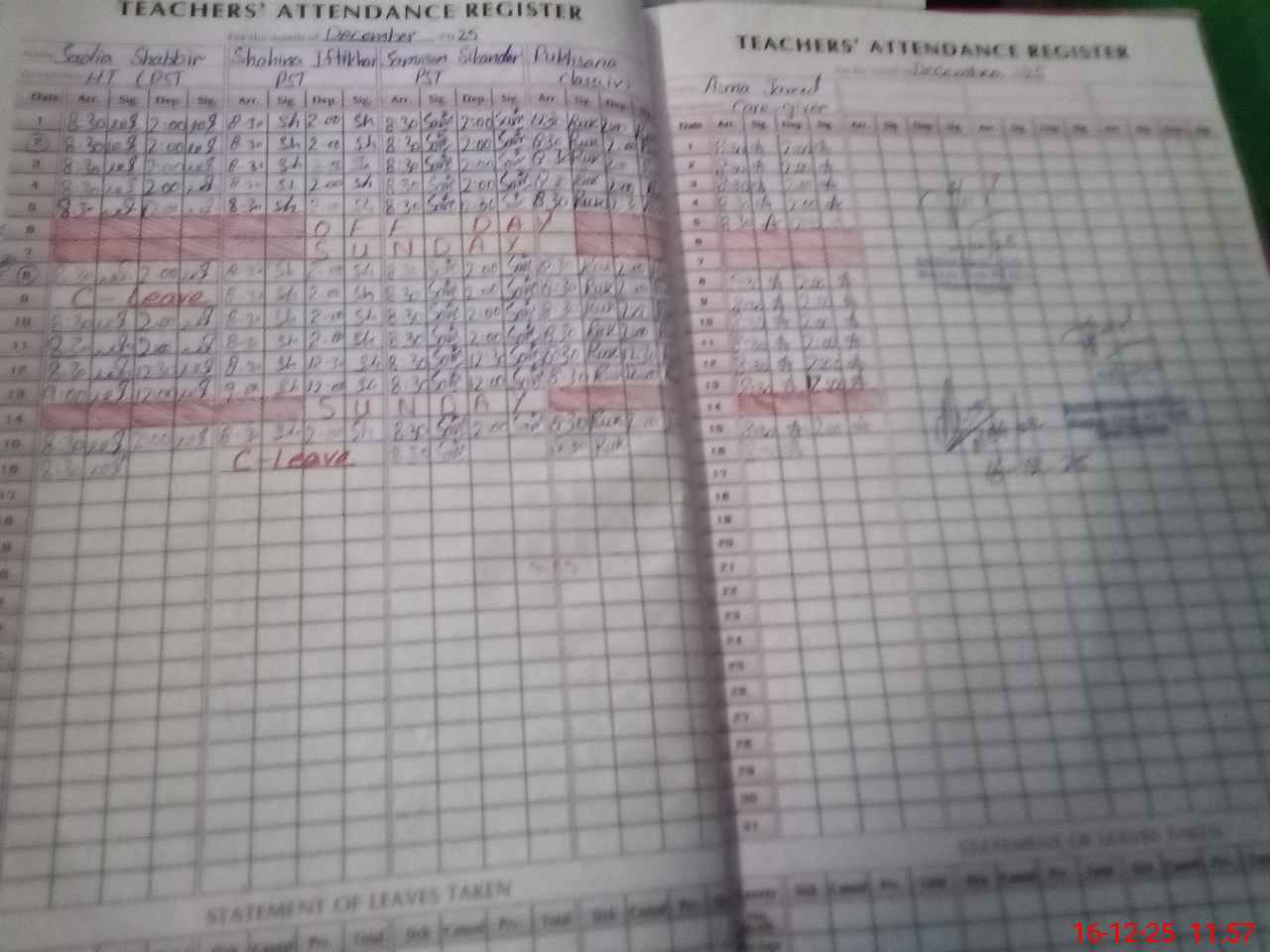 | Remarks (Use Separate Page if Required): Casual leave of PST Teacher Shaheena Iftikhar marked on attendence register but not approved yet now 1233pm | |||||