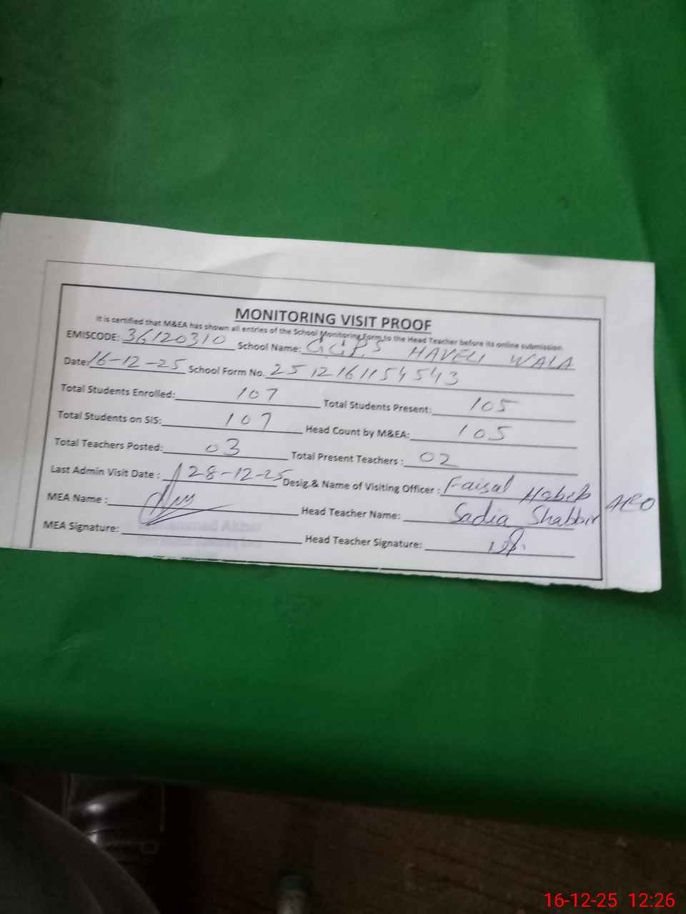 | EMIS Code: 36120310 | Name of School: GGPS HAVALI WALA SHUJABAD | |||