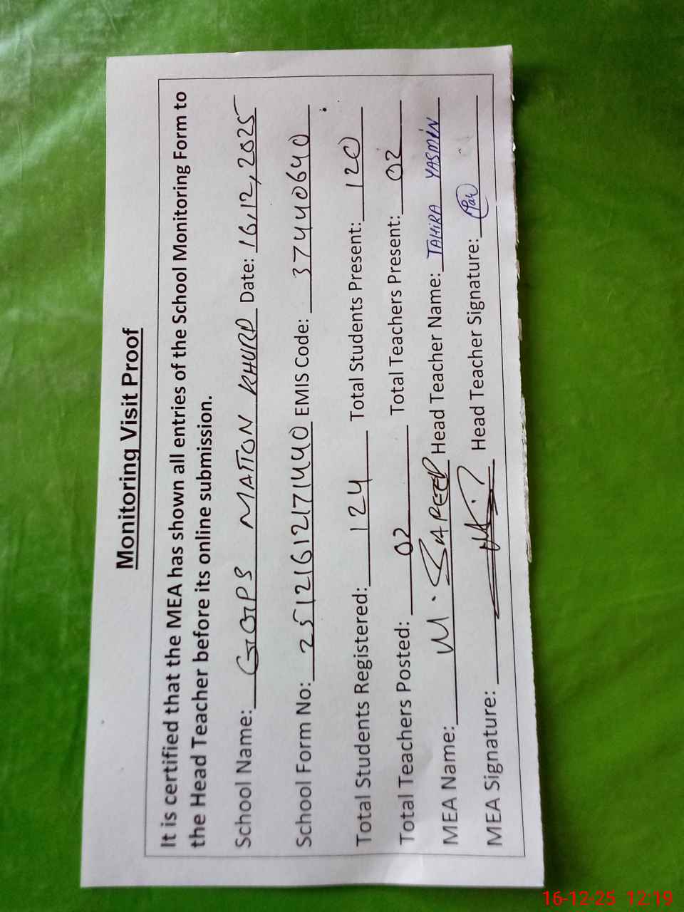 | Attendance Register | Head Teacher | MEA with School | Visit Proof |