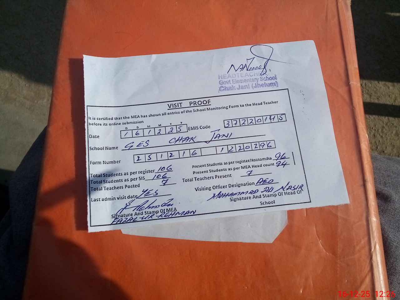 | Attendance Register | Head Teacher | MEA with School | Visit Proof |