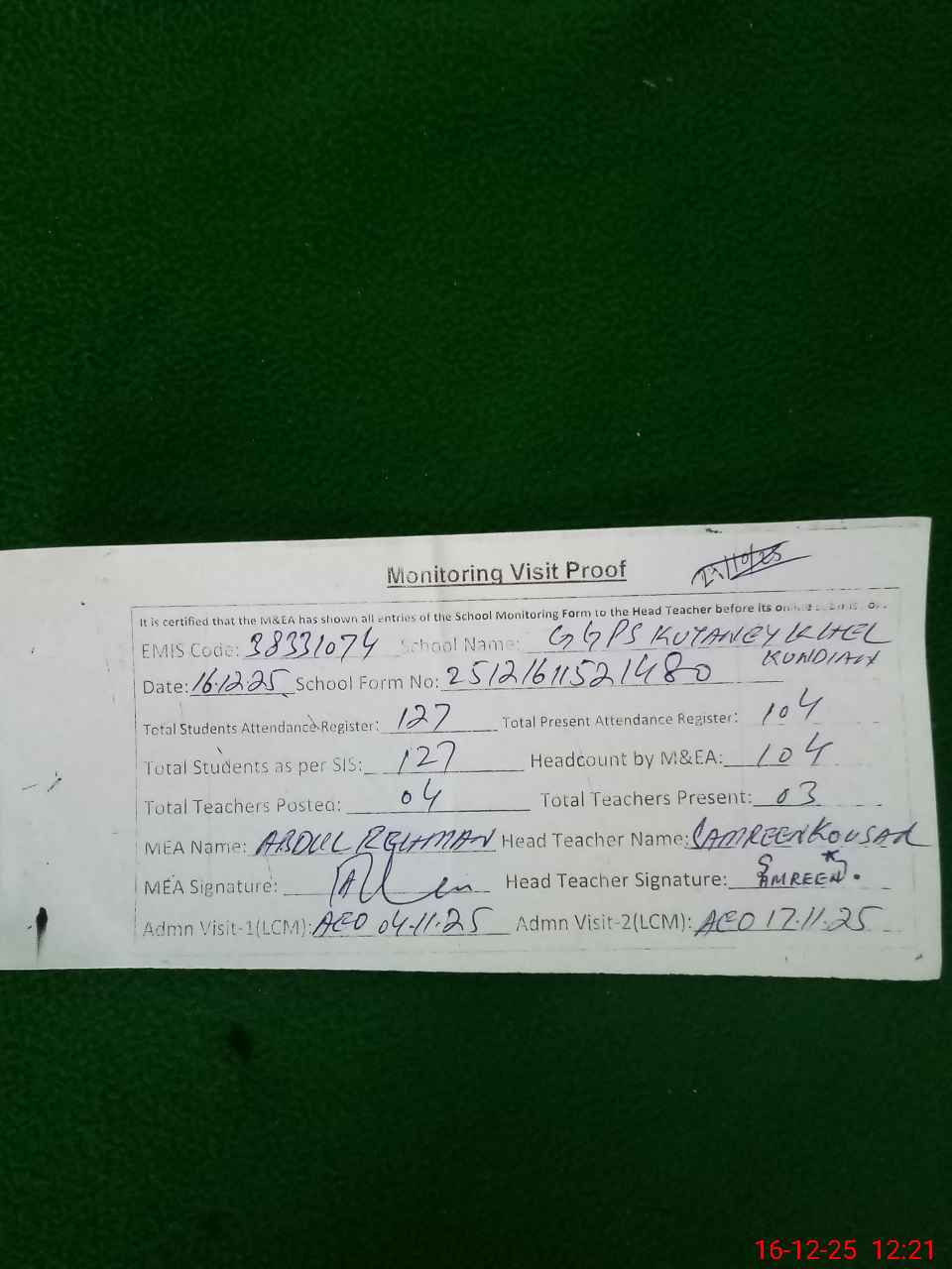 | EMIS Code: 38331074 | Name of School: GGPS KUTANAY KHEL KUNDIAN | |||