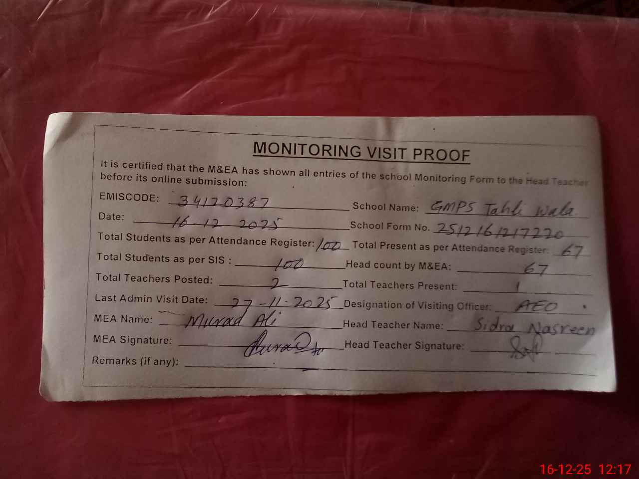 | Attendance Register | Head Teacher | MEA with School | Visit Proof |