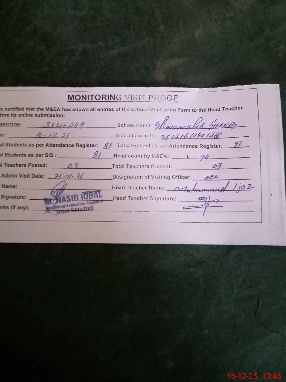 | Certified that this School was Inspected by the Undersigned MEA/DMO Today and the Information Stated Above is as Per Record. | |||||