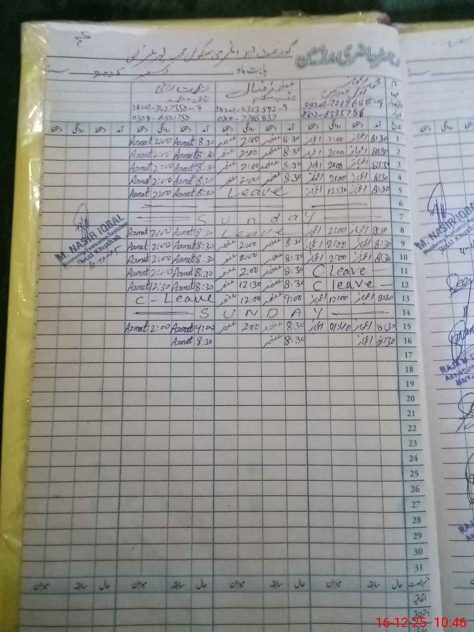 | CNIC | Full Name | Designation | R/C | Absence During Last Calender Month |