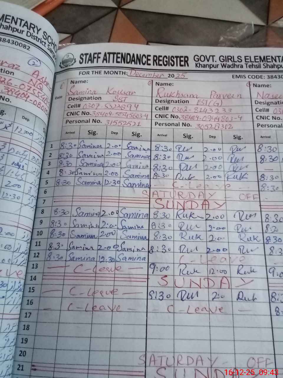 | CNIC | Full Name | Designation | R/C | Absence during last cal. month |