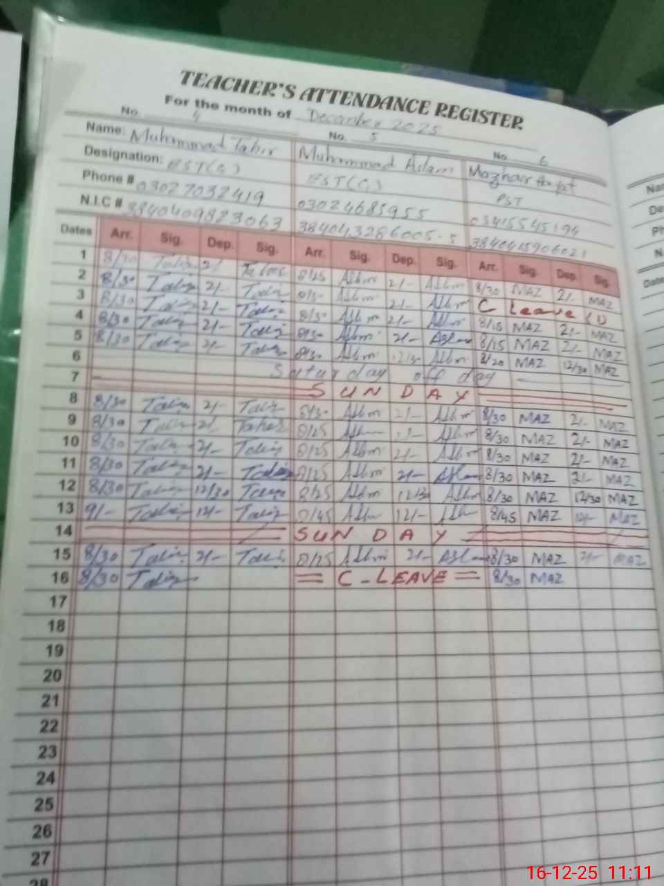 | CNIC | Full Name | Designation | R/C | Absence during last cal. month |