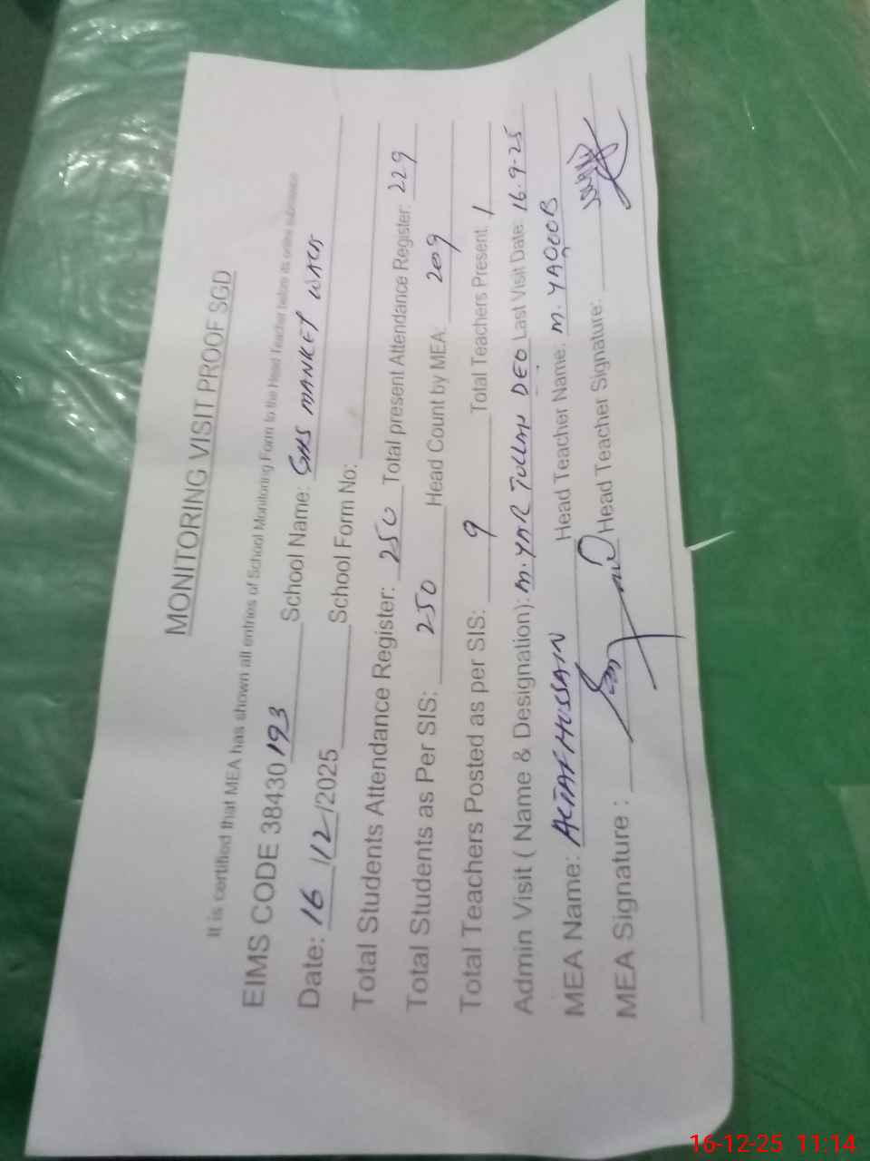 | Attendance Register | Head Teacher | MEA with School | Visit Proof |