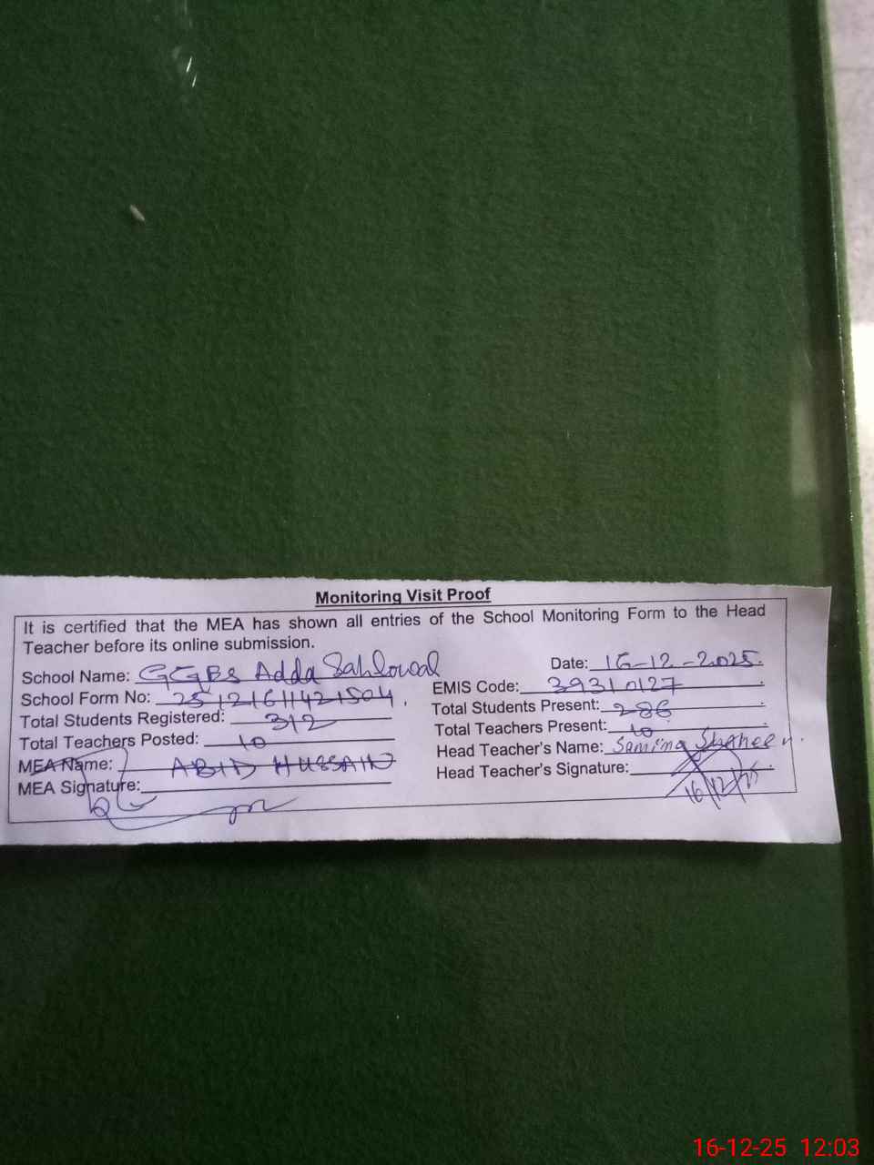 | Certified that this School was Inspected by the Undersigned MEA/DMO Today and the Information Stated Above is as Per Record. | |||||