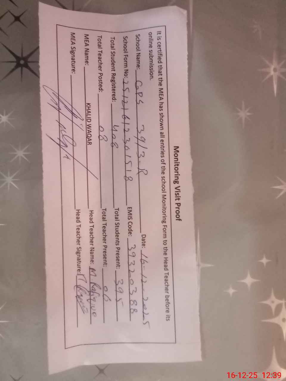 | Attendance Register | Head Teacher | MEA with School | Visit Proof |