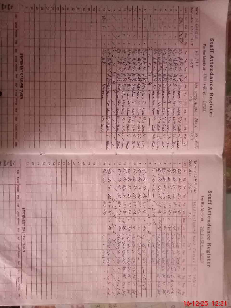 | CNIC | Full Name | Designation | R/C | Absence During Last Calender Month |