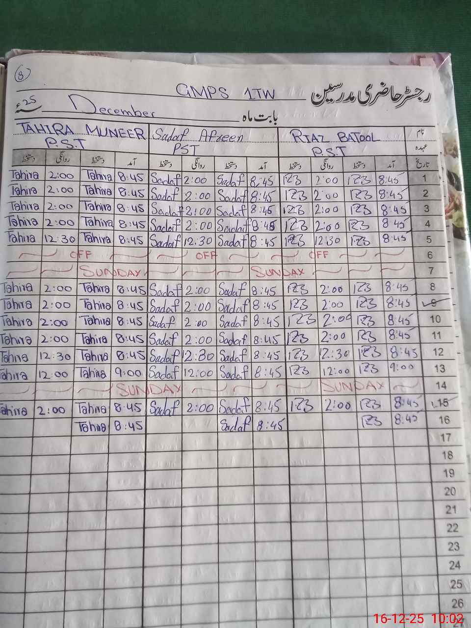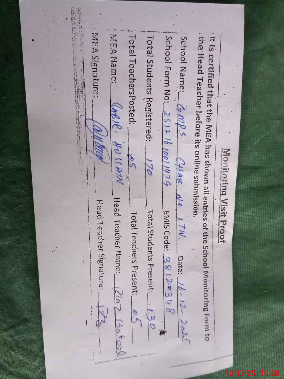| Remarks (Use Separate Page if Required): last visit by AEO SABBA ASHRAF on 15 12 2025 | |||||