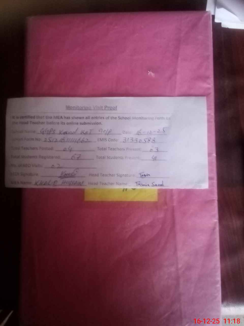 | Attendance Register | Head Teacher | MEA with School | Visit Proof |