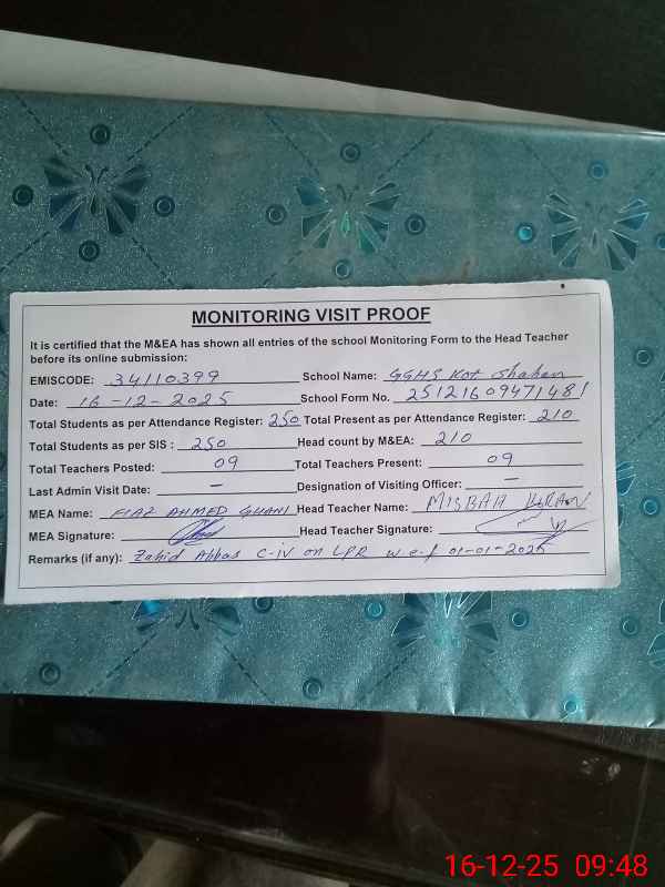 | EMIS Code: 34110399 | Name of School: GGHS KOT SHAHAN | |||