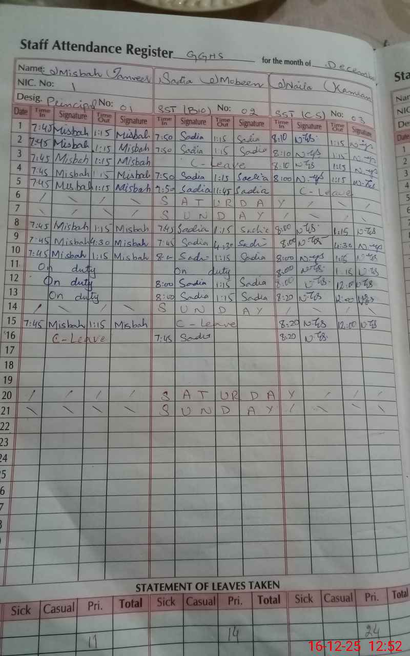 | CNIC | Full Name | Designation | R/C | Absence During Last Calender Month |