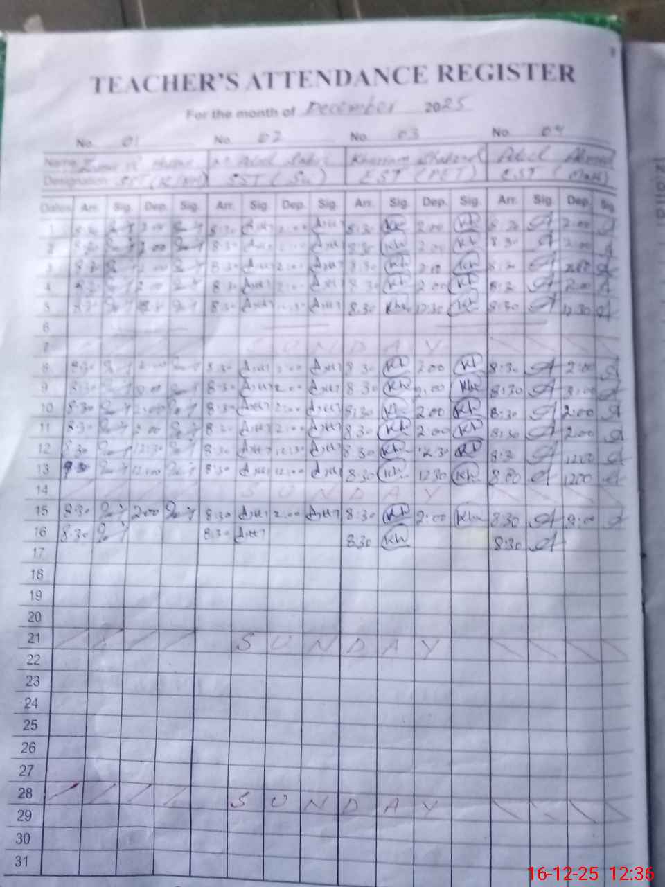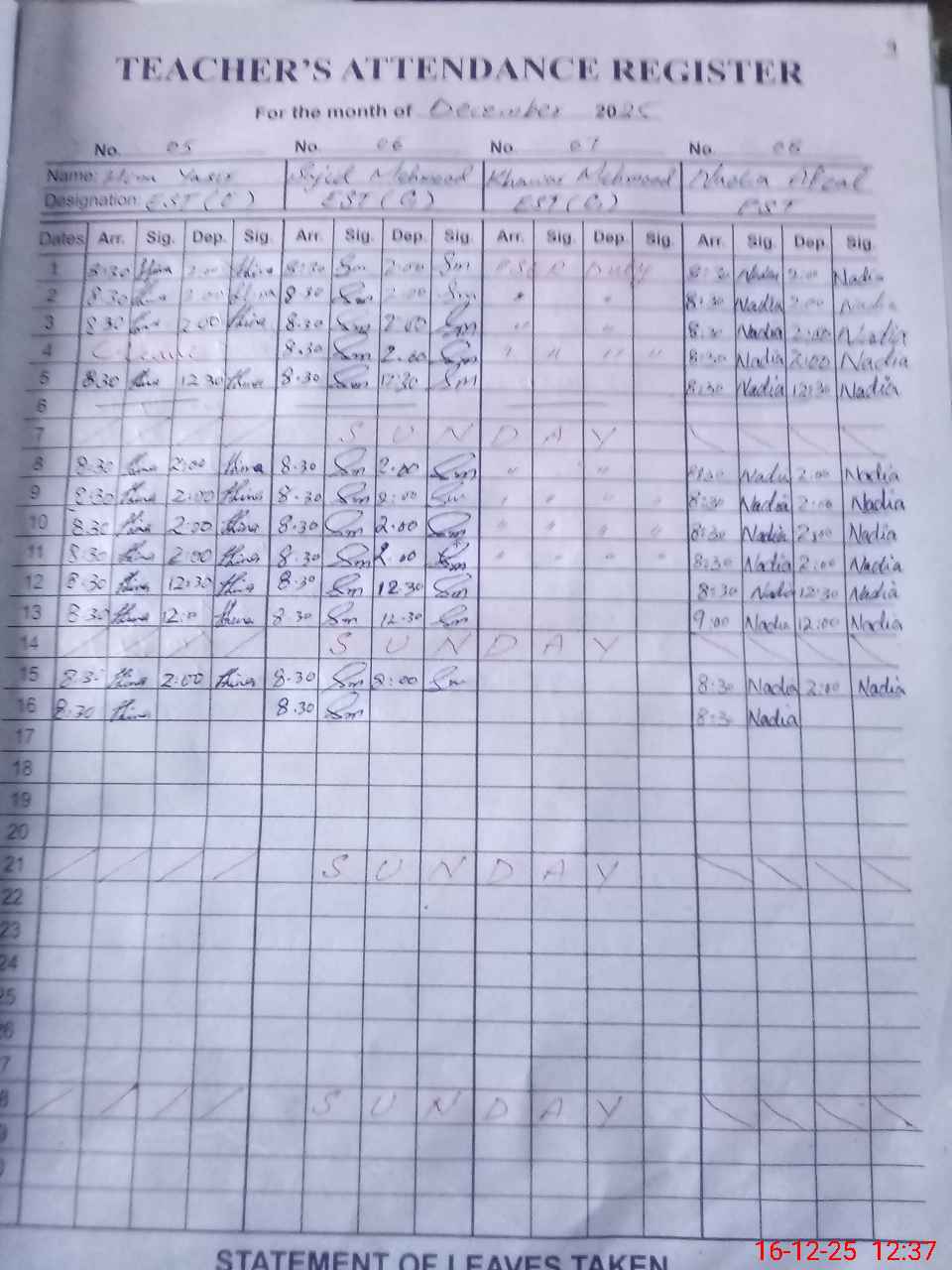 | CNIC | Full Name | Designation | R/C | Absence During Last Calender Month |