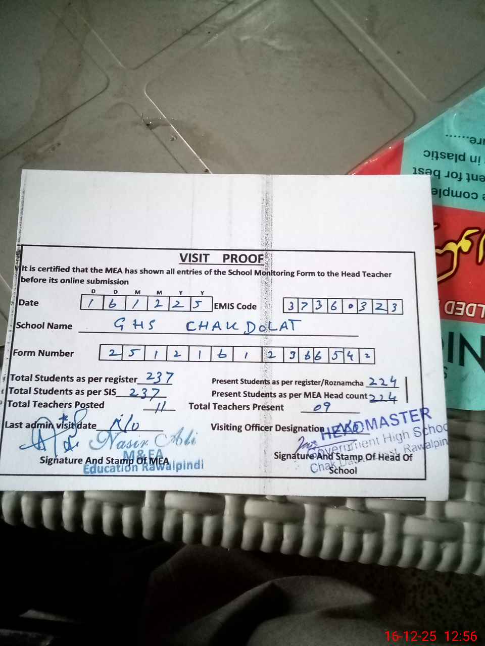 | Attendance Register | Head Teacher | MEA with School | Visit Proof |