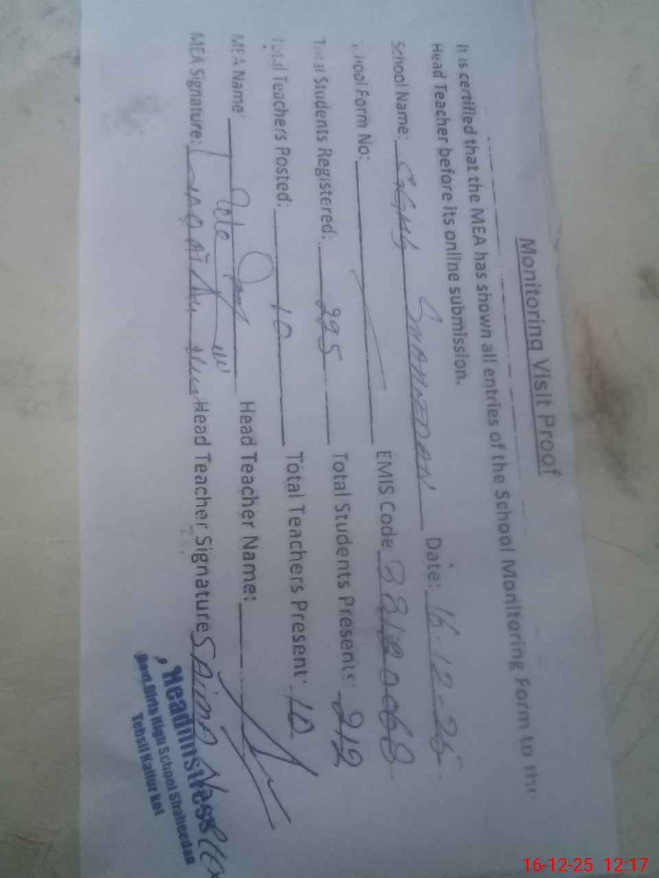| Attendance Register | Head Teacher | MEA with School | Visit Proof |