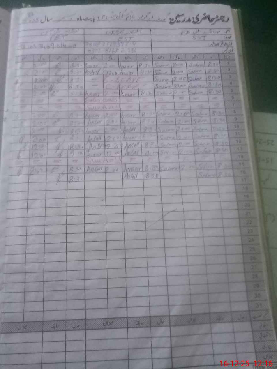 | CNIC | Full Name | Designation | R/C | Absence During Last Calender Month |