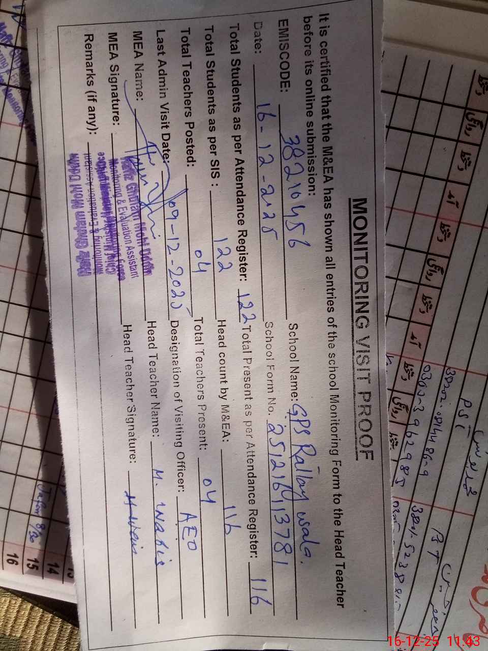 | Attendance Register | Head Teacher | MEA with School | Visit Proof |