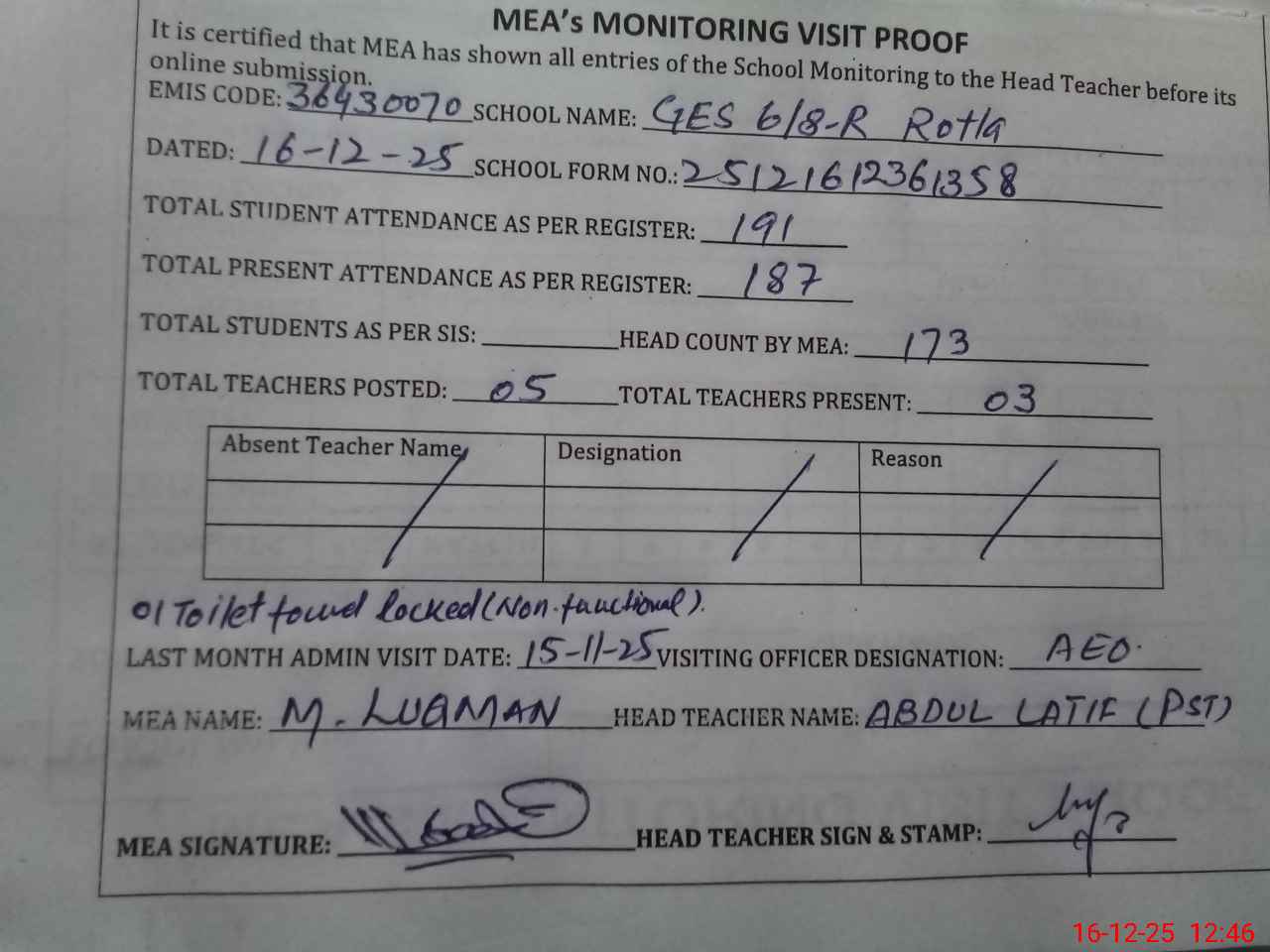 | Attendance Register | Head Teacher | MEA with School | Visit Proof |