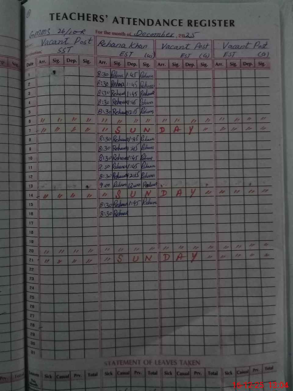 | CNIC | Full Name | Designation | R/C | Absence During Last Calender Month |