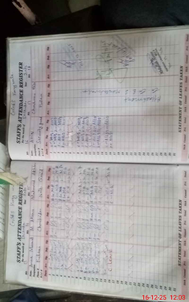 | CNIC | Full Name | Designation | R/C | Absence During Last Calender Month |