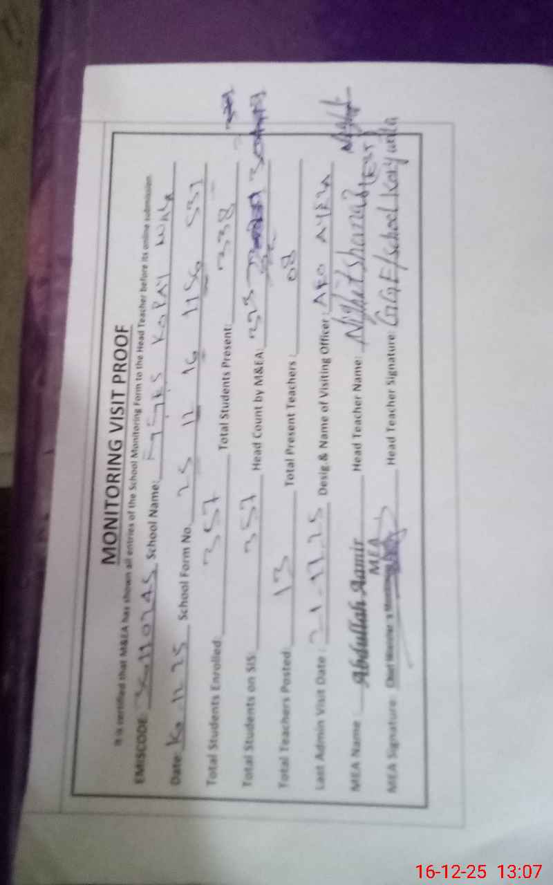 | EMIS Code: 36110245 | Name of School: GGES KOREY WALA MULTAN | |||