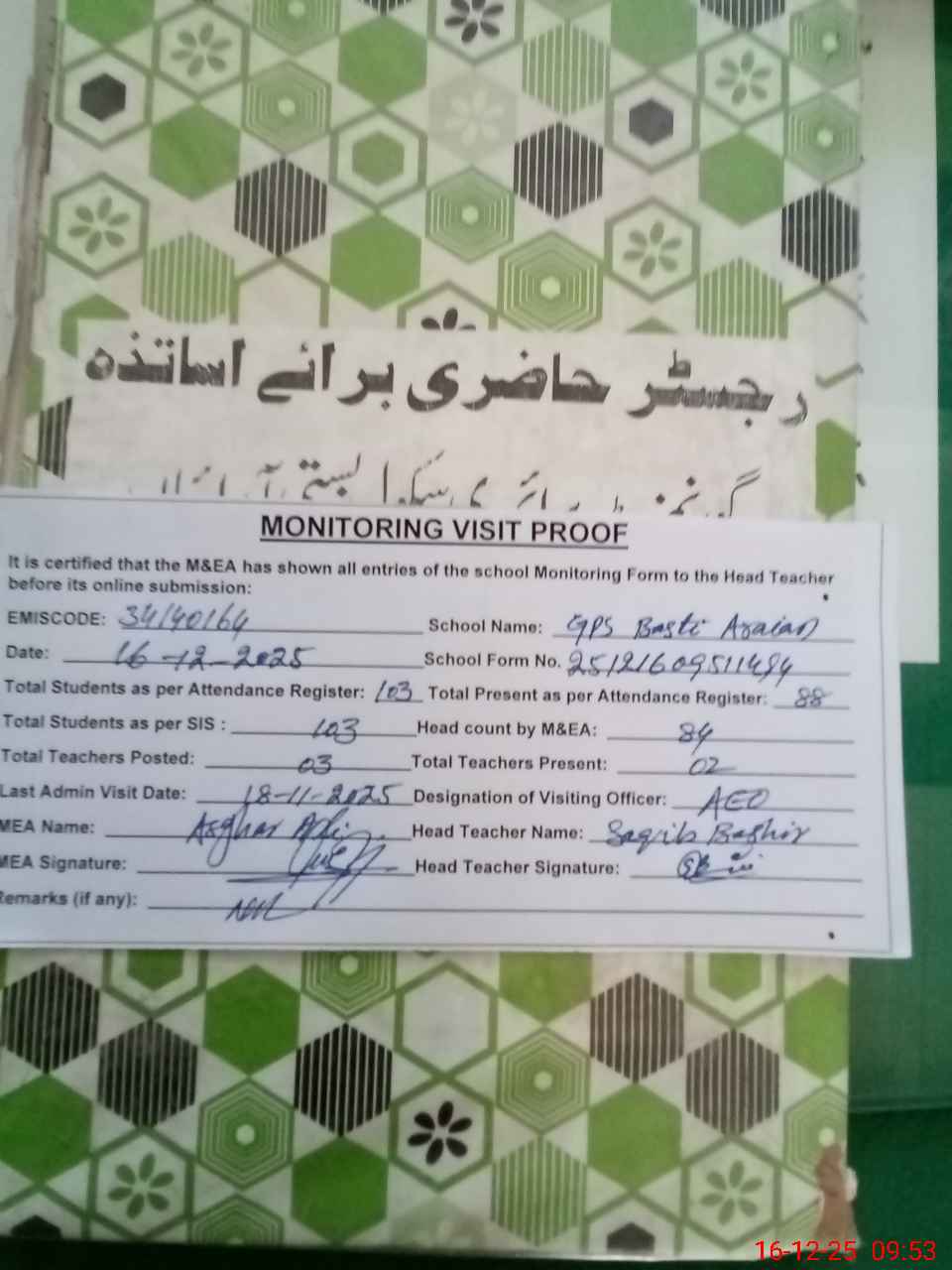 | Attendance Register | Head Teacher | MEA with School | Visit Proof |