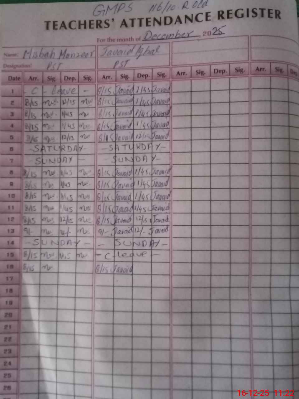 | CNIC | Full Name | Designation | R/C | Absence During Last Calender Month |