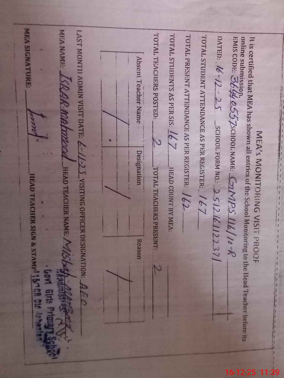 | Attendance Register | Head Teacher | MEA with School | Visit Proof |
