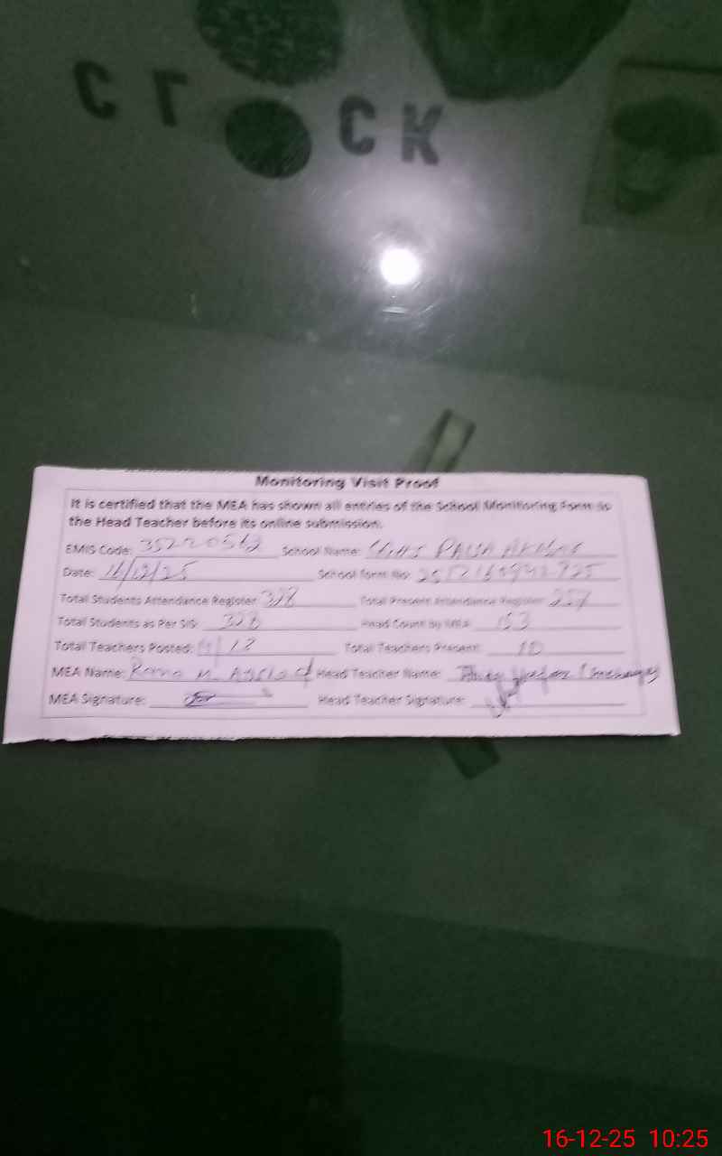 | Attendance Register | Head Teacher | MEA with School | Visit Proof |