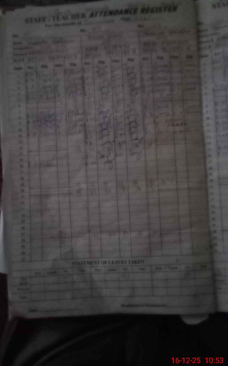| Remarks (Use Separate Page if Required): Teacher Samina EST on medical leave as per attendance register but her Sanctioned medical leave record not available on line or manual so according to monitoring sop mark her Absent | |||||