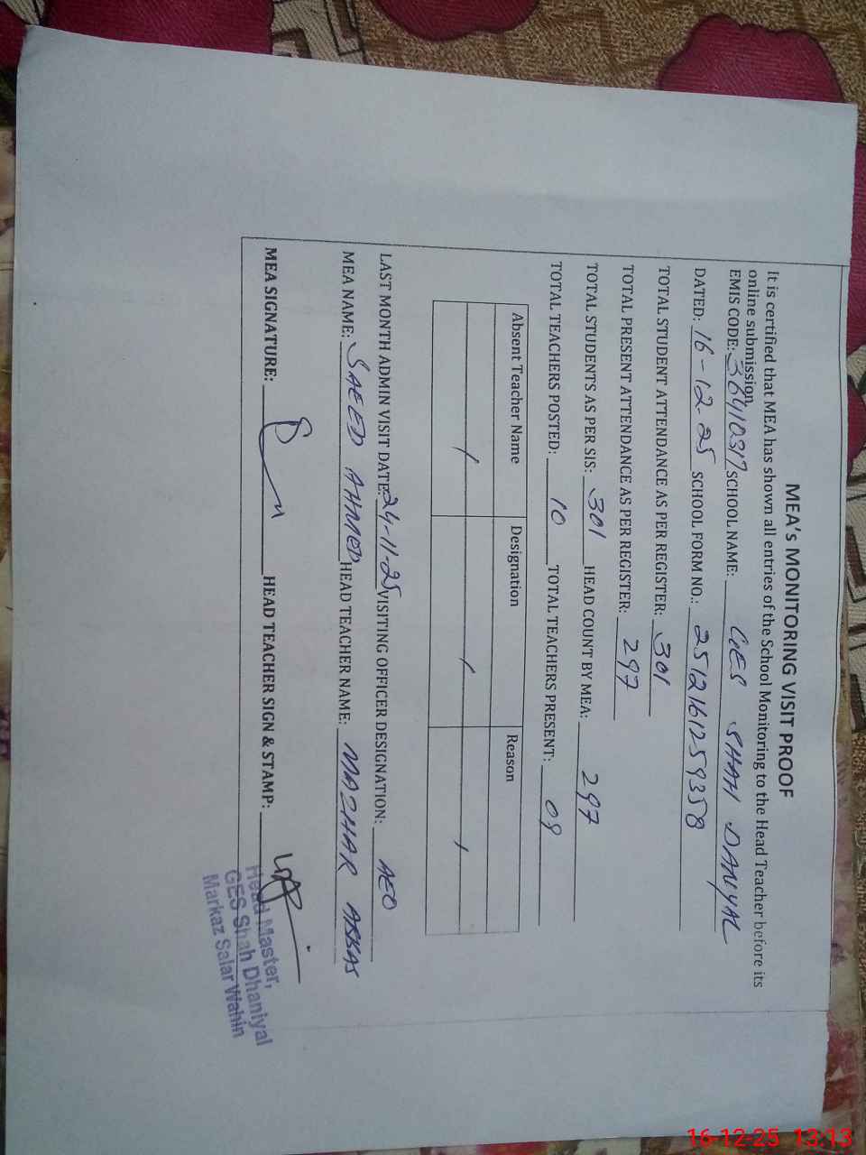 | Attendance Register | Head Teacher | MEA with School | Visit Proof |