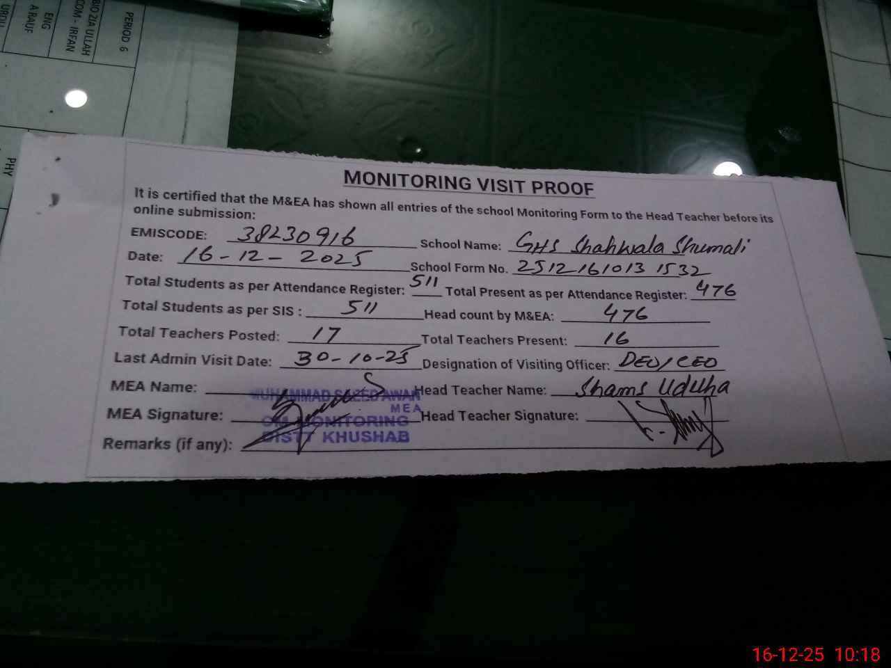| EMIS Code: 38230916 | Name of School: GHS SHAH WALA SHUMALI | |||