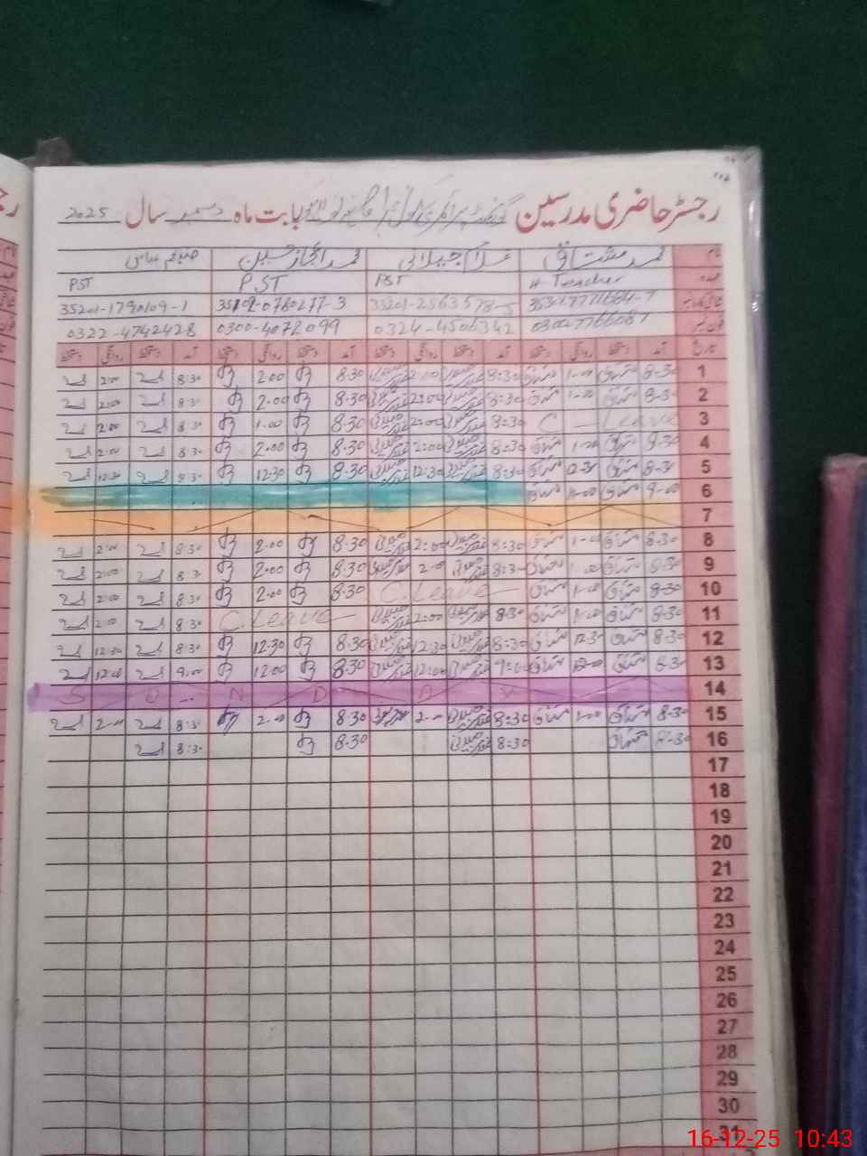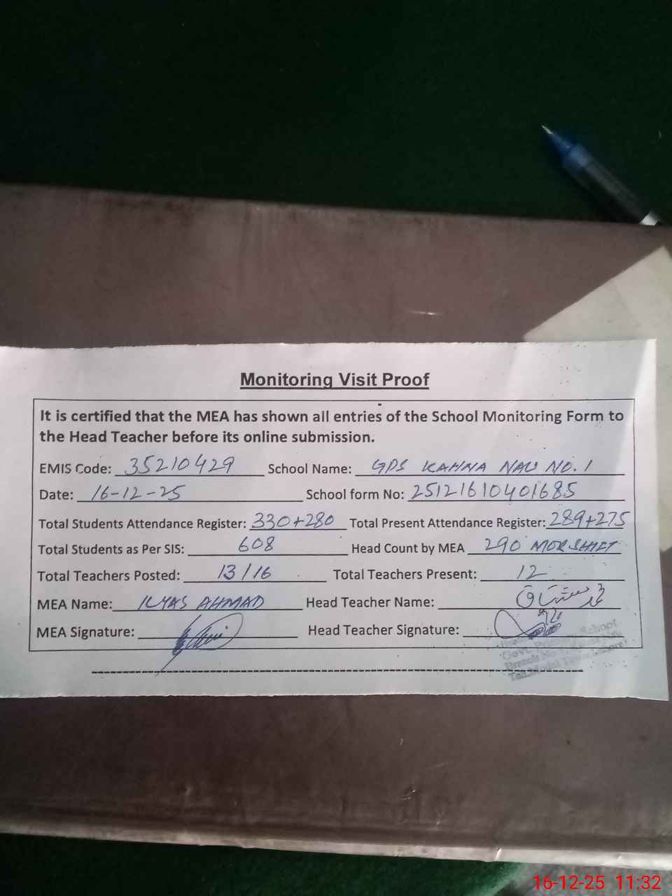| Remarks (Use Separate Page if Required): 6th class in 2nd shift random attendance is not taken DDEO visited on 19 November 2025 AEO visited on 6 Nov and 15 November 2025 | |||||