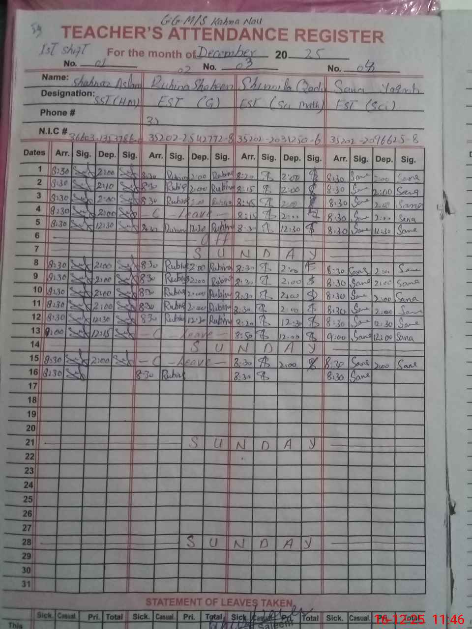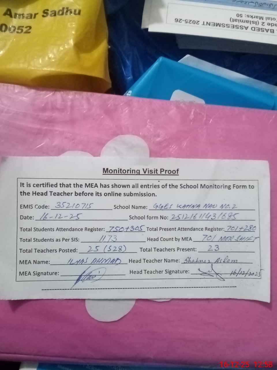 | Remarks (Use Separate Page if Required): Akhtar Hussain SG is marked absent today as attachment Orders are not available last Orders are wef 14 May 2025 for 89 days 03 Teachers on tab and 120 students showing in SIS Strength are now in GGPS Satellite kahna NAU EMIS Code 35211016 that is newly separately functioning 4th class in 2nd shift random attendance is not available DDEO visited on 16 December 2025 | |||||