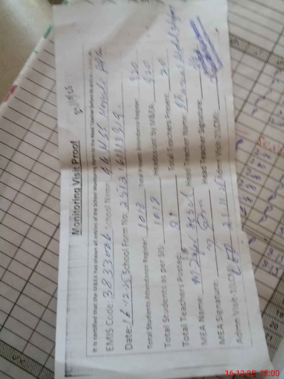 | Attendance Register | Head Teacher | MEA with School | Visit Proof |
