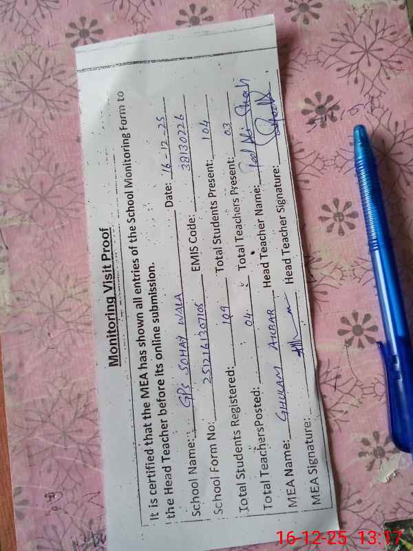 | Attendance Register | Head Teacher | MEA with School | Visit Proof |