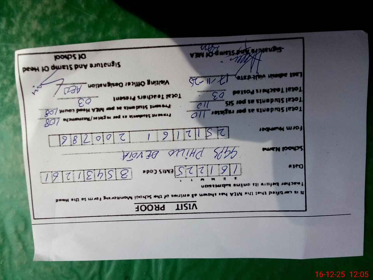 | Certified that this School was Inspected by the Undersigned MEA/DMO Today and the Information Stated Above is as Per Record. | |||||